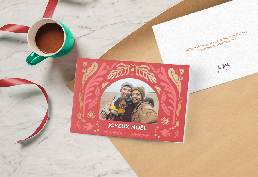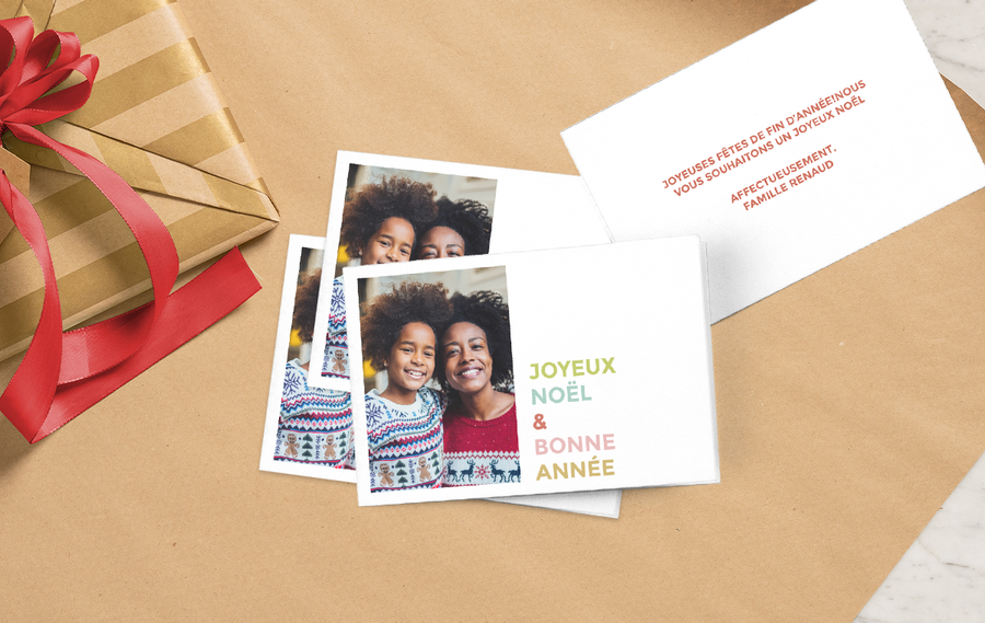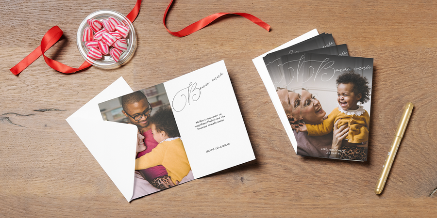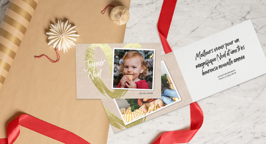 Placer une photo sur le recto de votre carte de Noël monalbumphoto est nullement une obligation. Pour changer un peu, pourquoi ne pas y ajouter votre propre message ? À l’aide de notre éditeur en ligne, vous pouvez enfiler votre manteau de graphiste et créer de superbes textes. Pour ce faire, un large éventail de polices de caractères, des plus contemporaines et élégantes aux plus amusantes en passant par les plus traditionnelles pour Noël, vous y sont proposées. Vous pouvez aussi ajouter des photos à l’intérieur de la carte comme effet de surprise. Notre blog couvre tous les aspects de la création d’une carte de Noël et de la manière de la présenter, et comprend même un guide pratique sur la rédaction de textes appropriés.