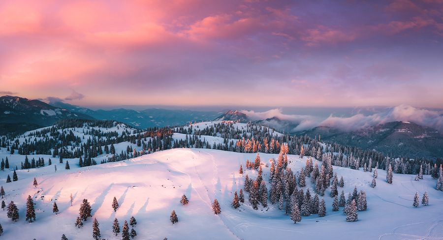 - La composition est primordiale. Si une photo de paysage ne vous coupe pas le souffle, c’est que le photographe s’est contenté de prendre un cliché sans chercher à transmettre la magie de l’instant. Lorsque vous tenez votre appareil entre vos mains, mettez-vous à la place d’un peintre. Pourquoi avez-vous envie de prendre cette photo ? Est-ce la lumière, la neige, la texture, la profondeur ou autre chose ? Construisez votre photo de sorte à laisser de la place pour transmettre votre histoire. Si vous assistez à un magnifique lever de soleil hivernal, laissez de la place aux tons pastel dans le ciel ; si vous photographiez des montagnes, laissez de la place aux sommets dans le ciel. Il suffit parfois de se déplacer de quelques centimètres pour modifier considérablement la perspective du paysage. Ne gaspillez pas votre temps avec des clichés moyens, prenez votre temps pour exprimer ce que vous ressentez au plus profond de vous-même.