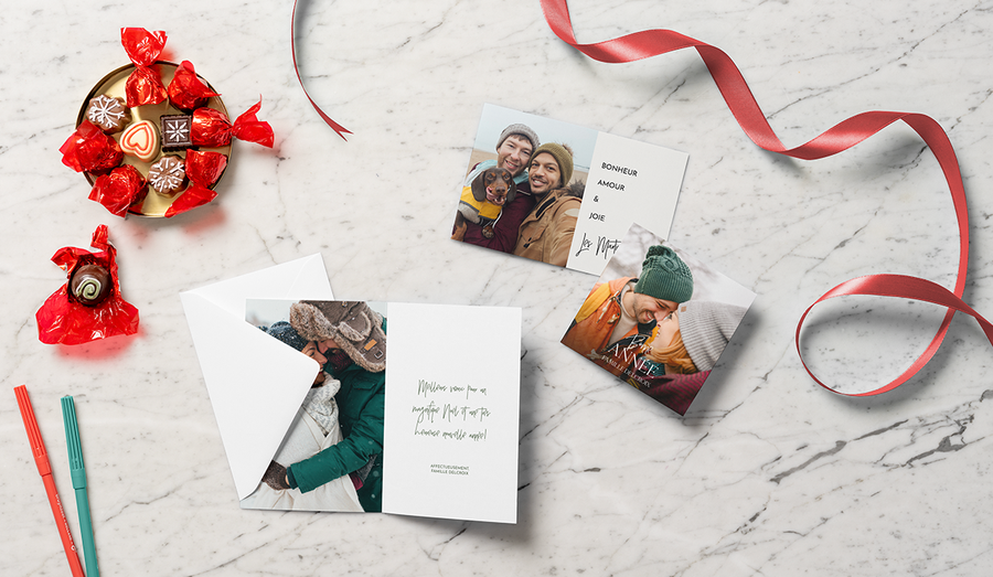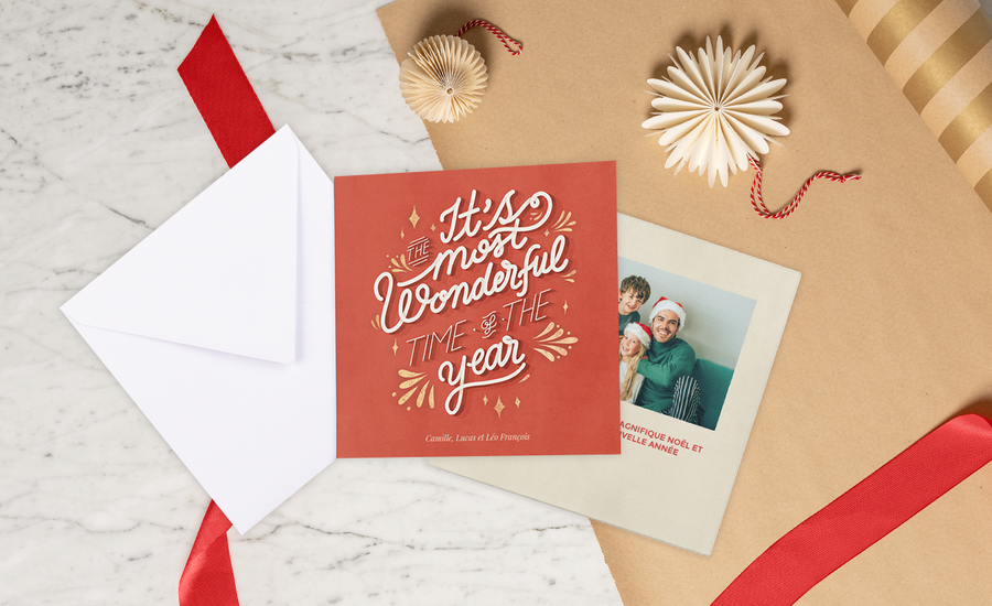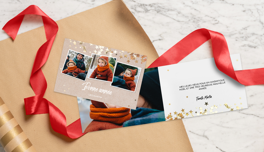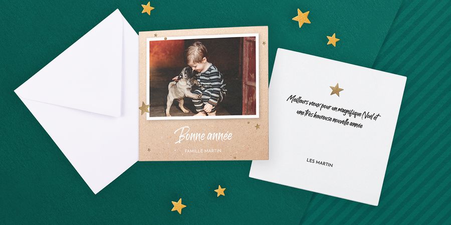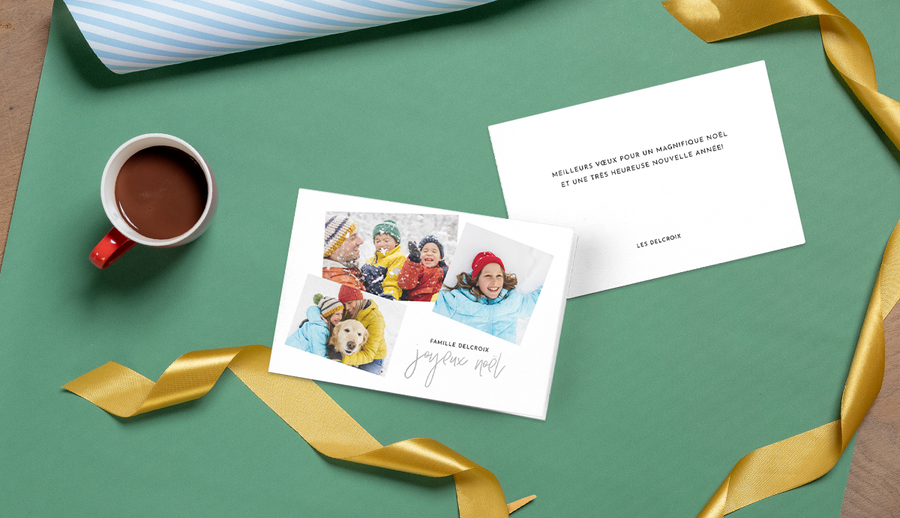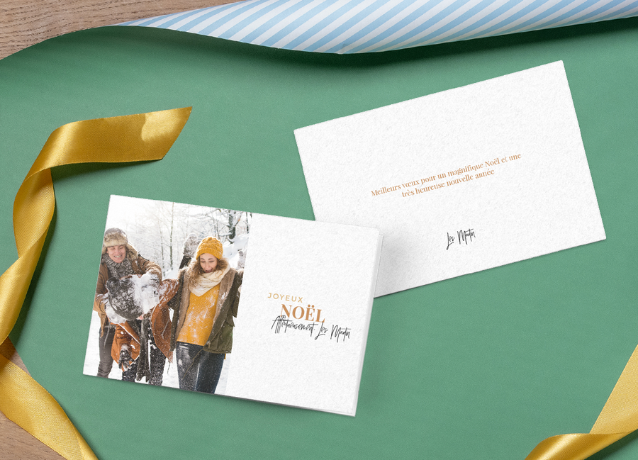 Une photo sur le recto de votre carte peut déjà en dire beaucoup, vous pouvez donc écrire un gentil texte court à l’intérieur. Ce type de carte est parfait pour envoyer à vos amis et à votre famille que vous voyez assez souvent, de sorte qu’ils n’auront pas besoin d’un résumé de ce que vous avez fait pendant l’année.