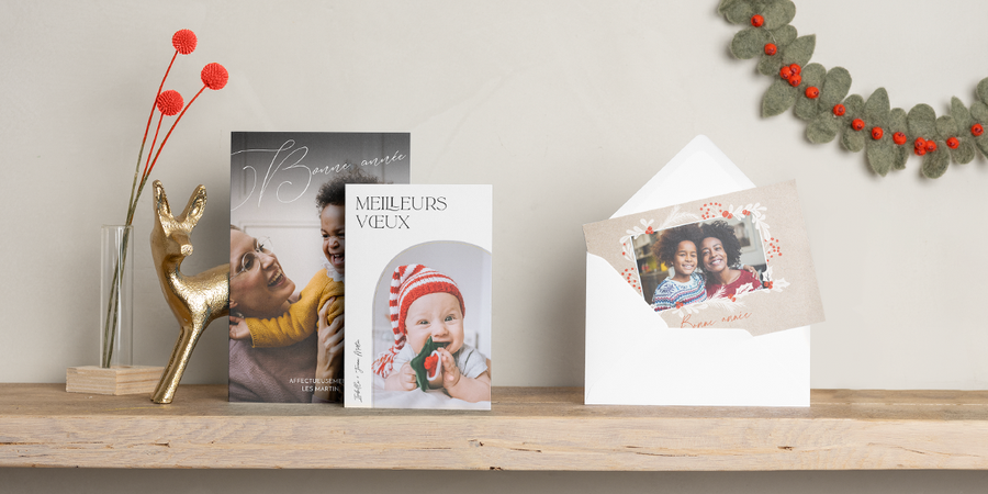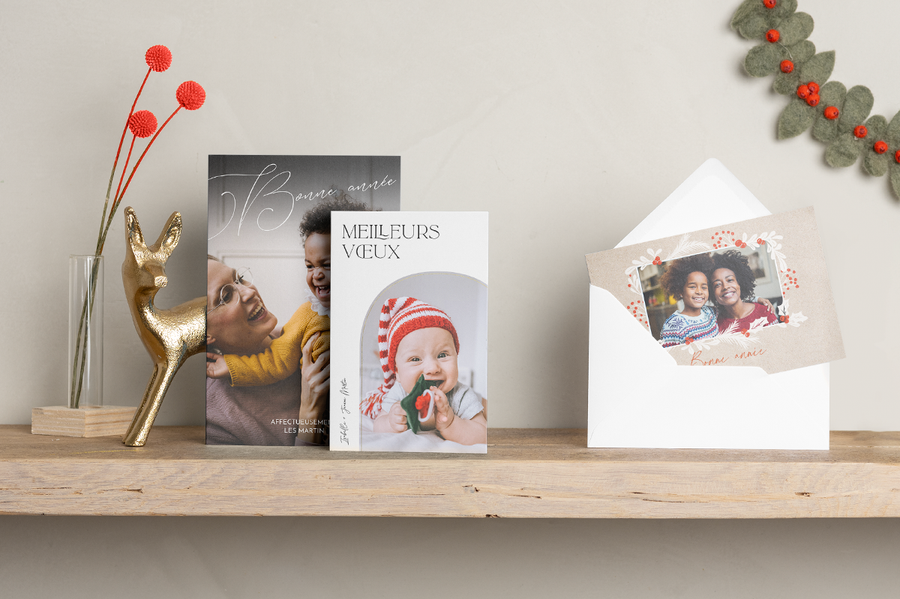 Il existe environ 180 modèles de cartes de Noël chez monalbumphoto que vous pouvez personnaliser avec vos propres photos et messages. De la classique à la ludique, de la moderne à la minimaliste, il y en a pour tous les goûts. Mais si vous vous sentez très créatif, vous pouvez créer votre propre design.
