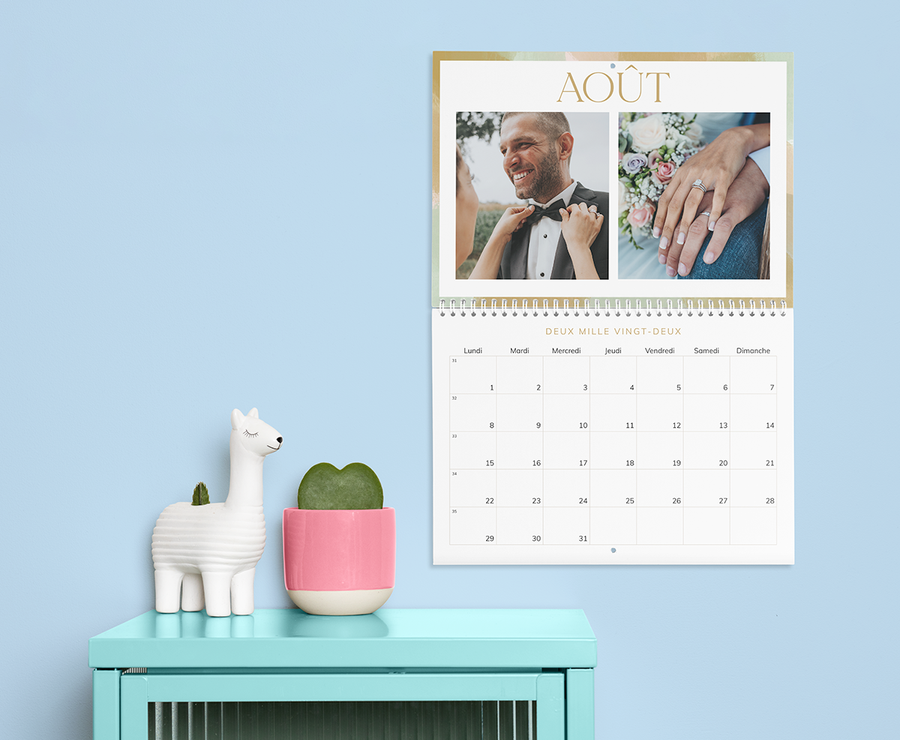 Si vous vous sentez particulièrement inspiré, réalisez un projet photo amusant sur votre processus de sélection pour le calendrier. Dénichez des photos de vous deux, des photos personnelles de vous et de votre partenaire, ou des photos de paysages époustouflants de vos plus beaux voyages, et classez-les par ordre chronologique. Veillez à ce que le mois de votre mariage corresponde au bon mois du calendrier, puis mettez-vous au travail pour faire correspondre le reste ! Le mois de mars vous renvoie peut-être à un séjour de ski avec les enfants et le mois de décembre à votre premier Noël en commun. Cela demande peut-être un peu plus d’efforts, mais c’est un excellent moyen de se rappeler les temps forts de votre vie commune et de faire resurgir chaque mois de nombreux souvenirs heureux.